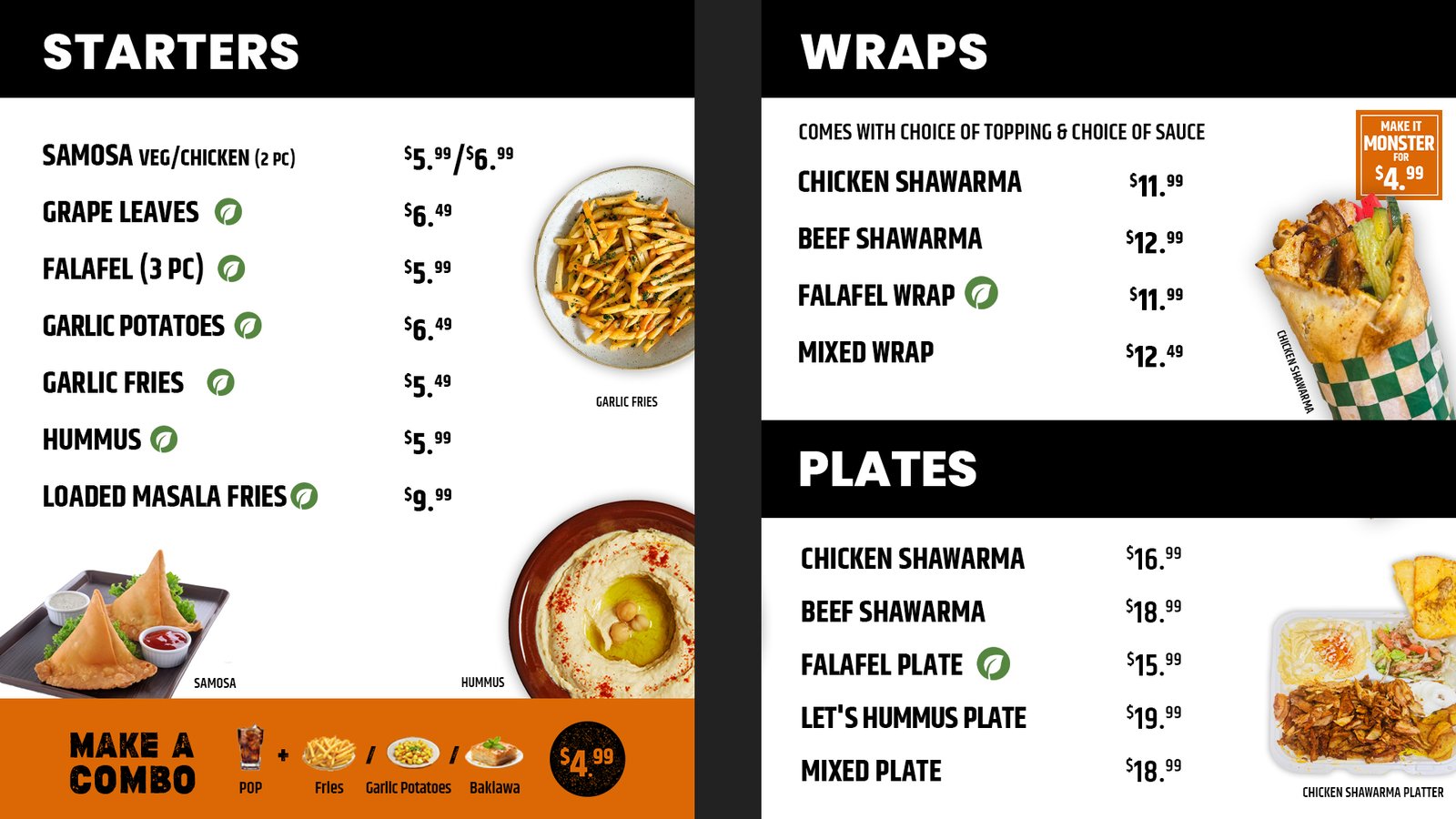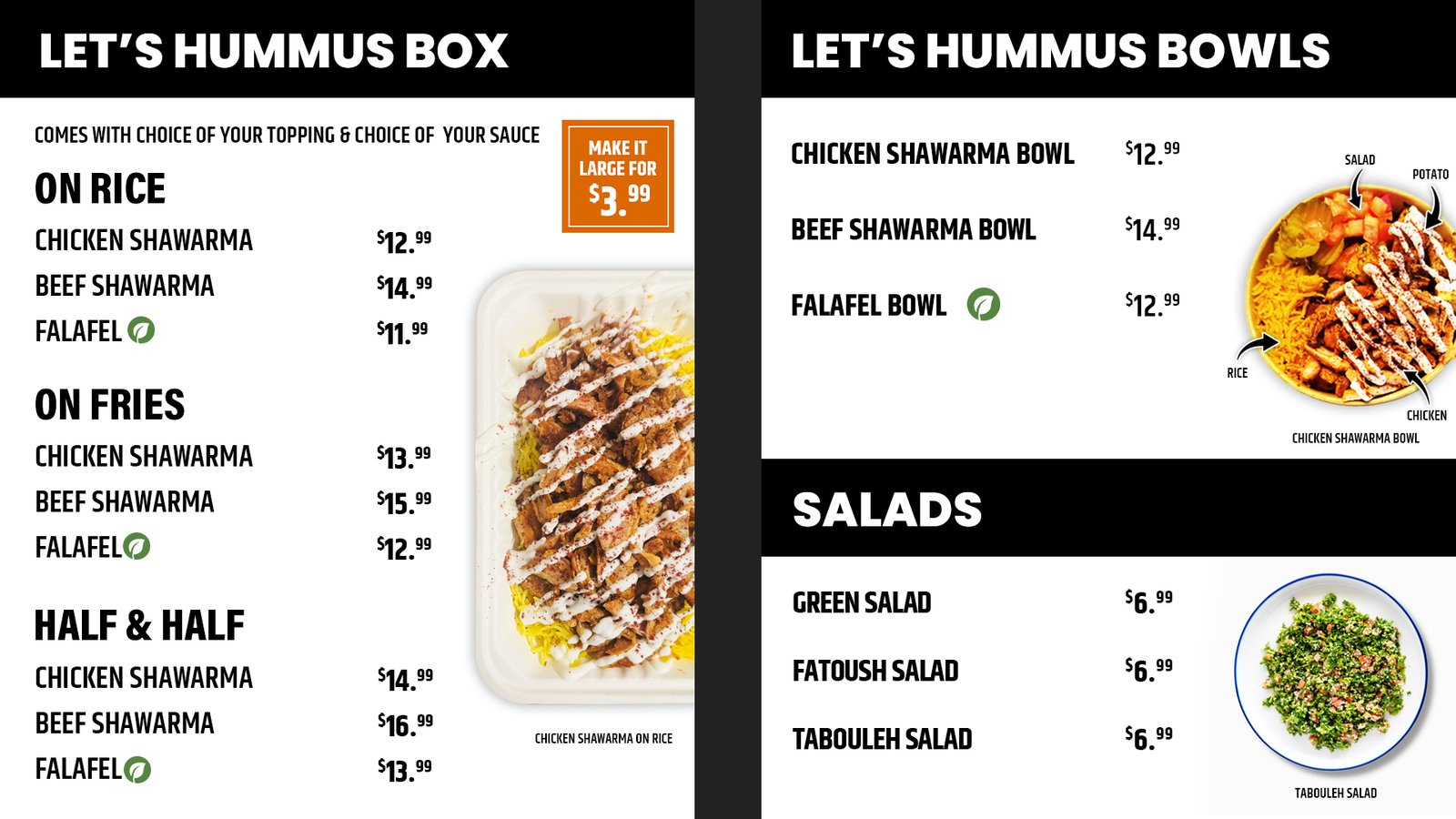 Savor every bite of our diverse menu, from sizzling shawarma wraps and kafta kabobs to vegan and vegetarian-friendly falafel plates. Whether you’re looking for a hearty meal or a quick snack, Let’s Hummus has something for everyone.